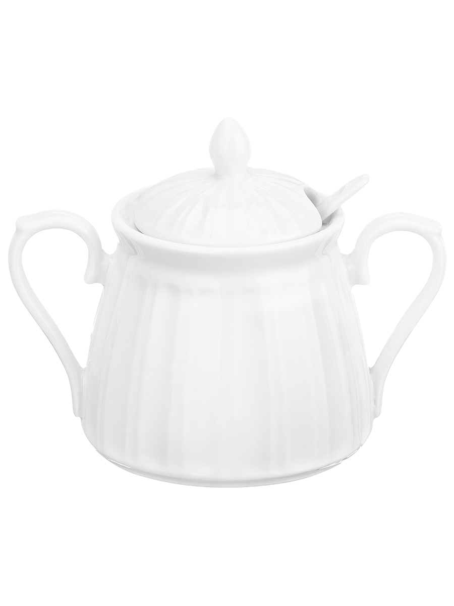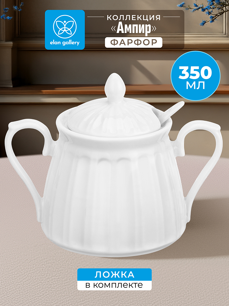 Сахарница из серии «Ампир» от Elan Gallery предназначена для эстетичной сервировки вашего стола. Размер ёмкости – 14,5х10х11,5 см, объём – 350 мл. Выполнена из высококачественного белого фарфора. Он не впитывает цвет продуктов и легко отмывается, благодаря чему надолго сохраняет свою белизну. Поверхность изделия украшает элегантный ребристый рельеф. Поставляется в комплекте с фарфоровой ложкой размером 13х2,5 см. Декоративная баночка подойдёт для хранения не только сахара, но и соли, специй и приправ. Засыпьте внутрь чай или кофе, чтобы в любой момент заварить свежий напиток. Подайте её вместе с горячими блюдами, чтобы каждый мог приправить пищу по своему вкусу. Эстетичную ёмкость также можно приспособить под варенье, мёд или икру. Маленькая ложечка позволит удобно набрать необходимое количество продуктов. Она компактно помещается в баночке благодаря выемке на крышке. Две ручки позволят удобно переносить и подавать изделие к столу. Не рекомендуется применять абразивные моющие средства. Подходит для использования в посудомоечной машине и микроволновой печи. Поставляется в дизайнерской картонной коробке – благодаря ей вам не потребуется дополнительная подарочная упаковка. Фарфоровая сервировочная посуда будет оригинальным подарком для хозяйки, ценящей не только практичность, но и привлекательность. Серия «Ампир» от бренда Элан Галерея станет украшением любого кухонного инвентаря и позволит собрать красивый сервиз в едином стиле!