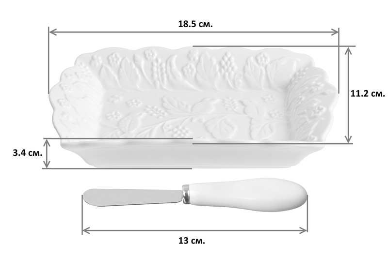 Тарелка под масло серии "Птички на ветке" 18,5х11,2х3,4 см выполнена из высококачественного фарфора с рельефным рисунком. В комплекте имеет нож. Длина ножика 13 см. Тарелочка изящно смотрится на столе и добавит изысканности любой сервировке. Не рекомендуется применять абразивные моющие средства. Без ножа фарфоровое блюдо можно использовать в посудомоечной машине и микроволновой печи. Поставляется в картонной коробке. Благодаря красочной коробочке не понадобится подарочная упаковка! Станет приятным подарком на любой праздник. В серии посуды из белого фарфора представлен широкий ассортимент товаров для сервировки стола, которые впишутся в любой интерьер благодаря лаконичному дизайну, натуральным материалам и высокой функциональности.