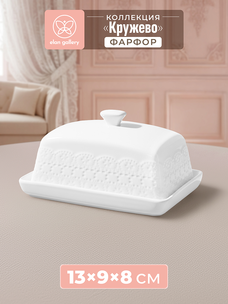 Маслёнка из серии «Кружево» от Elan Gallery предназначена для хранения и сервировки сливочного масла. Размер изделия – 13,5х9х8 см, высота без крышки – 1,5 см. Выполнена из высококачественного белого фарфора. Он не впитывает цвет продуктов и легко отмывается, благодаря чему надолго сохраняет свою белизну. Поверхность украшена рельефным кружевным узором. Используйте маслёнку для подачи масла, сыра и лимонов, а также хранения этих продуктов в холодильнике. Ёмкость выступит в качестве небольшой конфетницы для разнообразных сладостей: зефира, безе, леденцов и мармелада. Фигурная крышка придаст эффектность любой подаче. Не рекомендуется применять абразивные моющие средства. Подходит для использования в посудомоечной машине и микроволновой печи. Поставляется в дизайнерской картонной коробке – благодаря ей вам не потребуется дополнительная подарочная упаковка. Серия «Кружево» от бренда Элан Галерея станет украшением любого кухонного инвентаря и позволит собрать красивый сервиз в едином стиле!