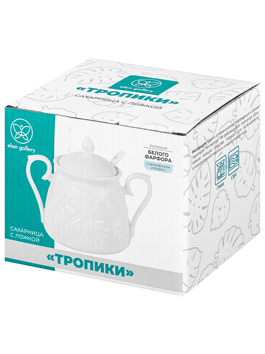 Сахарница из серии «Тропики» от Elan Gallery предназначена для эстетичной сервировки вашего стола. Размер ёмкости – 14,5х10х11,5 см, объём – 350 мл. Выполнена из высококачественного белого фарфора. Он не впитывает цвет продуктов и легко отмывается, благодаря чему надолго сохранит свою белизну. Поверхность украшена рельефным узором в виде тропических листьев. Поставляется в комплекте с фарфоровой ложкой размером 13х2,5 см. Декоративная баночка добавит особого шарма вашему кухонному инвентарю. Она подойдёт для хранения не только сахара, но и соли, специй и приправ. Засыпьте внутрь чай или кофе, чтобы в любой момент заварить свежий напиток. Подайте её вместе с горячими блюдами, чтобы каждый мог приправить пищу по своему вкусу. Стильное изделие также можно приспособить под варенье, мёд или икру. Маленькая ложечка позволит набрать необходимое количество продуктов. Она компактно помещается в баночке благодаря выемке на крышке. Изделие с двумя ручками удобно переносить и подавать к столу. Не рекомендуется применять абразивные моющие средства. Подходит для использования в посудомоечной машине и микроволновой печи. Поставляется в дизайнерской картонной коробке – благодаря ей вам не потребуется дополнительная подарочная упаковка. Фарфоровая сервировочная посуда будет оригинальным подарком для хозяйки, ценящей не только практичность, но и привлекательность. Серия «Тропики» от бренда Элан Галерея станет украшением любого кухонного инвентаря и позволит собрать красивый сервиз в едином стиле!