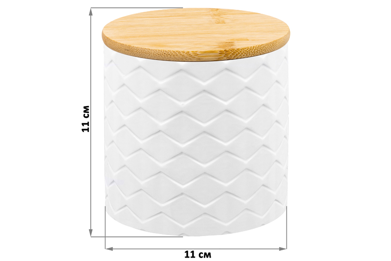 Банка “Аргайл” с деревянной крышкой предназначена для хранения разнообразных продуктов. Размер изделия – 11х11х11 см, объём – 650 мл. Баночка выполнена из керамики и опоясана рельефным геометрическим узором в виде несомкнутых ромбов. Она подойдёт для чая, кофе, сахара и соли. Заполните её специями и приправами, чтобы во время готовки всё необходимое было под рукой. Она также послужит для хранения круп и орехов, конфет, печений и других сладостей. Бамбуковая крышка с силиконовыми уплотнителями имеет плотную посадку и не даст содержимому просыпаться. Благодаря лаконичному дизайну банка впишется в интерьер любой кухни. Не рекомендуется применять абразивные моющие средства. Ёмкость без бамбуковых элементов можно использовать в посудомоечной машине и микроволновой печи. Бамбук нельзя замачивать. Поставляется в прочной картонной упаковке. Банка станет практичным подарком для любой хозяйки и отлично дополнит ваш кухонный инвентарь.