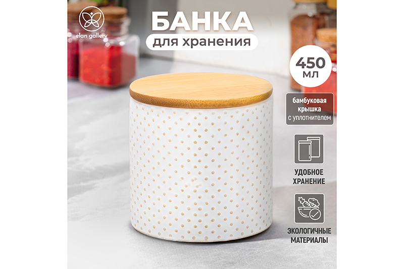 Банка "Бисер" от Elan Gallery предназначена для организации хранения продуктов на вашей кухне. Размер ёмкости – 9,5х9,5х9,5 см, объём – 450 мл. Высота без крышки – 9 см. Баночка молочно-белого цвета выполнена из керамики. Её поверхность украшена рельефным узором, напоминающим мелкие бусинки. Крышка выполнена из натурального бамбука и оснащена силиконовым уплотнителем. Керамическое изделие подойдёт для хранения любых сыпучих продуктов: сахара и соли, чая и кофе, а также специй и приправ. Храните в баночке ягоды, орехи и сухофрукты. Заполните её любимыми сладостями: леденцами, конфетами или печеньем. Подайте к столу, чтобы идеально дополнить чайную сервировку! Герметичная бамбуковая крышечка защитит ваши продукты от попадания грязи и пыли. Благодаря своему лаконичному дизайну и универсальному цвету изделие впишется в любой интерьер. Вы с лёгкостью организуете хранение даже на открытых полках. Не рекомендуется применять абразивные моющие средства. Без крышки подходит для мытья в посудомоечной машине. Нельзя использовать в микроволновой печи. Бамбук нельзя замачивать. Поставляется в дизайнерской картонной коробке – благодаря ей вам не потребуется дополнительная подарочная упаковка. Это хороший подарок для тех, кто ценит сочетание стиля и практичности. В ассортименте бренда Элан Галерея представлены банки для хранения на любой вкус. Соберите целый набор контейнеров для эстетичного хранения продуктов на вашей кухне!