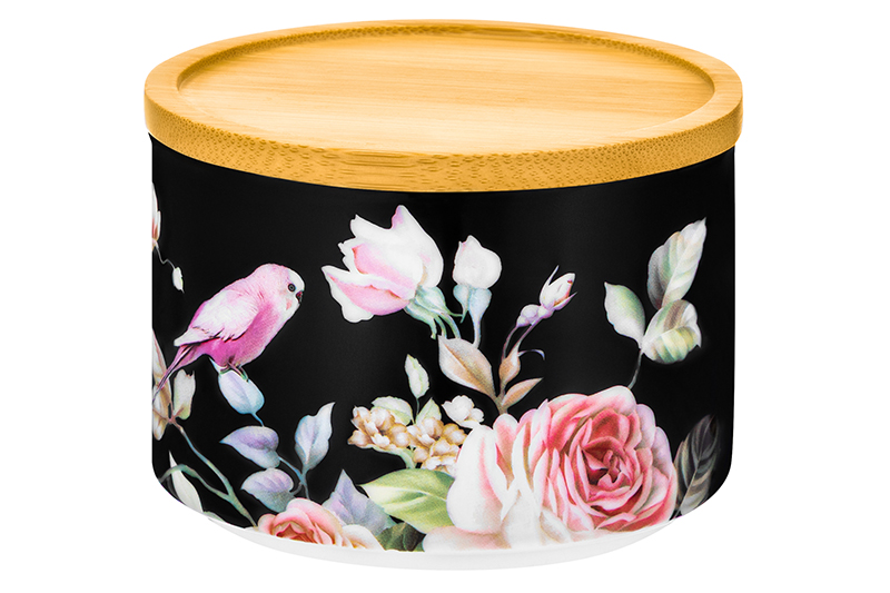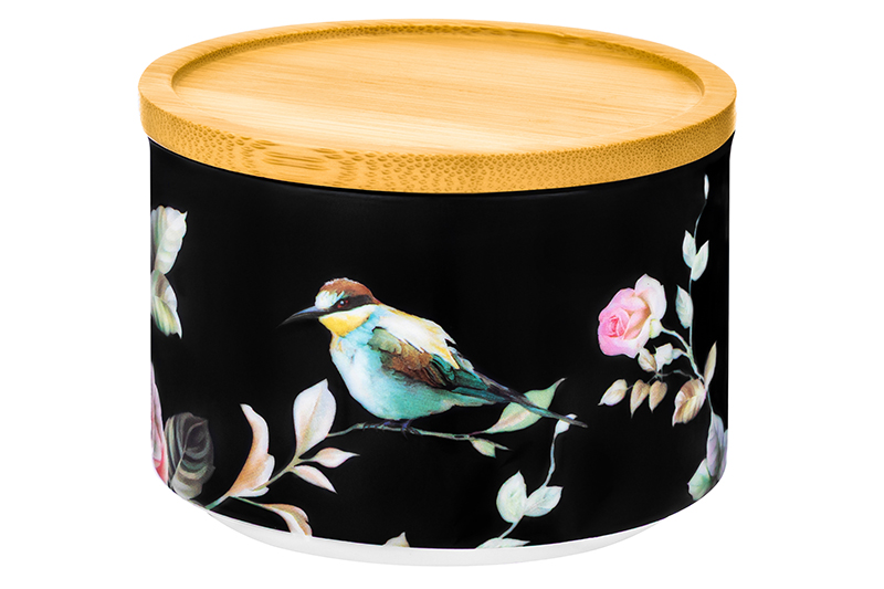 БЫЛО 513 руб! Банка д/хранения и запекания 250 мл 9,3*9,3*7 см "Певчие птички на черном" с бамб.крышк-подставкой