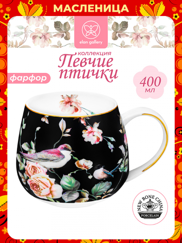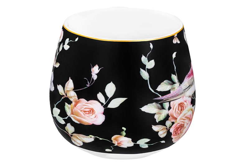 БЫЛО 513 руб! Кружка 400 мл 12,5*9,5*8,5 см "Певчие птички на черном" бочонок, фарфор NEW BONE CHINA