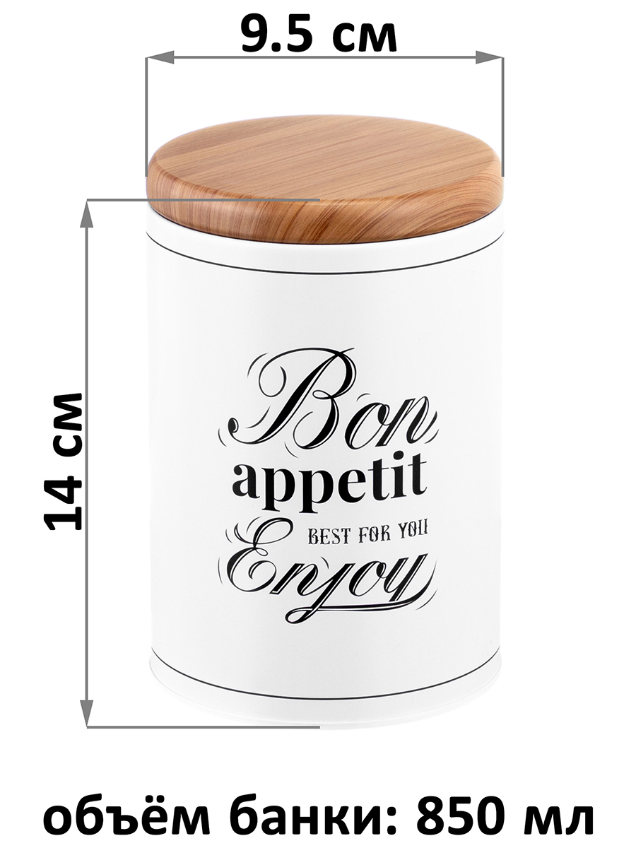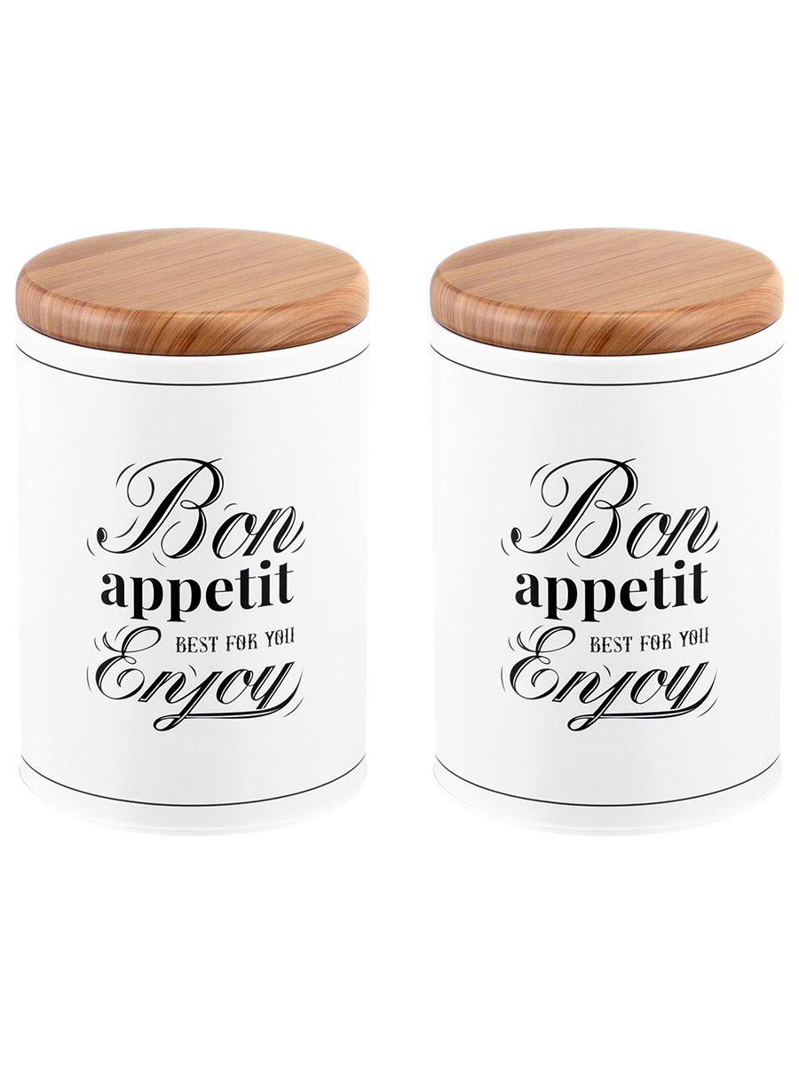 Набор 2 банок для хранения послужит органайзером на вашей кухне. Размер каждой ёмкости – 9,5х9,5х14 см, объём – 850 мл. Выполнены из жести. «Bon Appetit» – это коллекция посуды в стиле френч-винтаж, которая создаст на вашей кухне атмосферу романтики и уюта. Отличительные черты серии – это сочетание светлых оттенков и монохромной картинки, стилизованной под ретро. Лаконичная фраза «Bon Appetit. Best for you. Enjoy» («Приятного аппетита. Лучшее – для вас. Наслаждайтесь») добавит изысканности интерьеру вашей кухни. Крышки изделий визуально имитируют древесину. Каждая баночка отлично подойдёт для разнообразных сыпучих продуктов: чая, кофе, сахара и соли, приправ и специй. Храните в них крупы, ягоды, орехи и сухофрукты. Заполните контейнеры маленькими сладостями: конфетами, леденцами или драже. Подайте баночки к столу, чтобы идеально дополнить чайную сервировку! Герметичная крышка защитит ваши продукты от попадания пыли и грязи. Не рекомендуется применять абразивные моющие средства. Не подходят для использования в посудомоечной машине и микроволновой печи. Поставляются в красивой картонной коробке – благодаря ей вам не потребуется дополнительная подарочная упаковка. Это идеальный подарок для хозяйки, ценящей не только практичность, но и стиль. Коллекция посуды «Bon Appetit» впишется в любой интерьер и придаст ему шарма и элегантности!