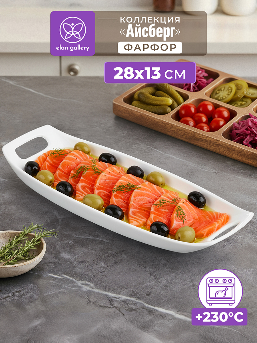 Блюдо из серии «Айсберг» от Elan Gallery предназначено для эстетичной сервировки вашего стола. Размер изделия – 28,5х13х2 см, внутренний размер по дну – 21х12х1,5 см. Выполнено из высококачественного белого фарфора. Он не впитывает цвет продуктов и легко отмывается, благодаря чему надолго сохраняет свою белизну. Фигурная тарелка подойдёт для подачи рыбных и мясных блюд, а также разнообразных закусок. Используйте её для сервировки салатов, сырной нарезки, овощей и фруктов, – угостите большое количество гостей. На сервировочном блюде удобно разместить кусочки торта и пирога, конфеты, зефир, а также другие десерты и сладости, чтобы дополнить уютное чаепитие. Удобные ручки облегчат переноску изделия. Не рекомендуется применять абразивные моющие средства. Подходит для использования в посудомоечной машине и микроволновой печи. Поставляется в картонной коробке – благодаря ей вам не потребуется дополнительная подарочная упаковка. Фарфоровая сервировочная посуда будет оригинальным подарком для хозяйки, ценящей не только практичность, но и привлекательность. Серия «Айсберг» от бренда Элан Галерея станет украшением любого кухонного инвентаря и позволит собрать красивый сервиз в едином стиле!