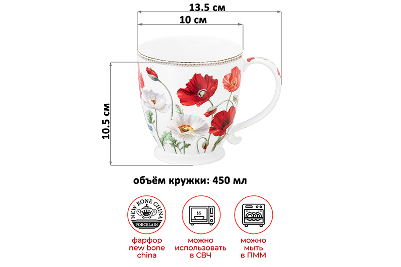 БЫЛО 551 руб! Кружка 450 мл 13,5*10*10,5 см "Маки" на ножке NEW BONE CHINA