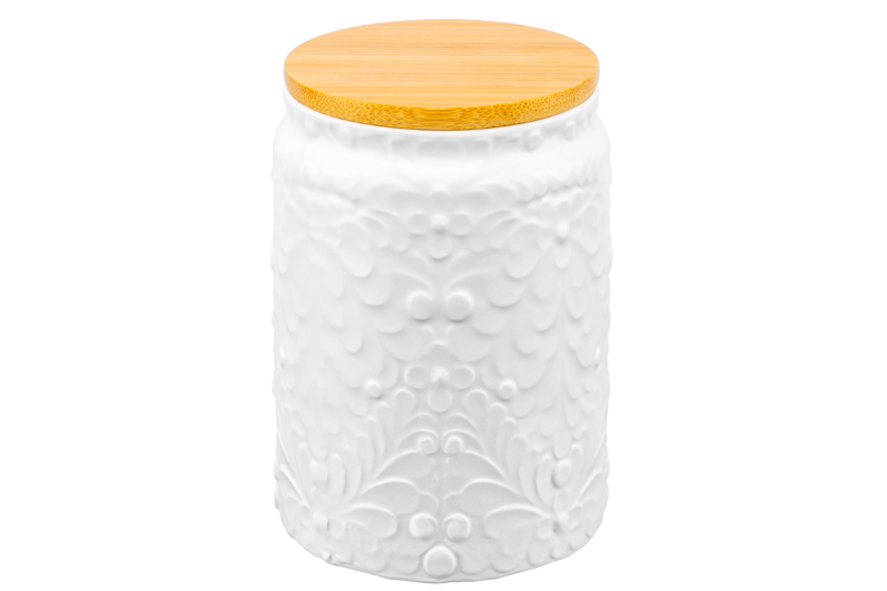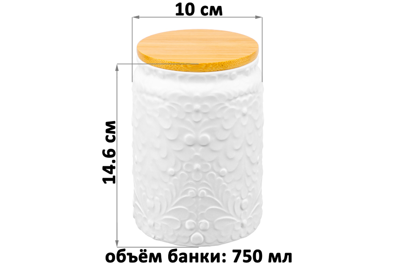 Банка от Elan Gallery предназначена для организации хранения продуктов на вашей кухне. Размер ёмкости – 10х10х14,6 см, объём – 750 мл. Выполнена из керамики и имеет белый цвет, матовая поверхность украшена рельефным лиственным узором. Крышка выполнена из натурального бамбука и оснащена силиконовым уплотнителем. Изделие отлично подойдёт для хранения сыпучих продуктов: сахара и соли, чая и кофе, приправ и специй. Храните в баночке ягоды, орехи и сухофрукты. Заполните её любимыми сладостями: леденцами, конфетами или печеньем. Подайте к столу, чтобы идеально дополнить чайную сервировку! Герметичная деревянная крышечка защитит ваши продукты от попадания грязи и пыли. Коллекция из двух баночек лаконичных цветов впишется в любой интерьер и позволит организовать хранение даже на открытых полках. Не рекомендуется применять абразивные моющие средства. Не подходит для использования в микроволновой печи. Без бамбуковой крышки подходит для посудомоечной машины. Бамбук нельзя замачивать! Поставляется в дизайнерской картонной коробке – благодаря ей вам не потребуется дополнительная подарочная упаковка. Это идеальный подарок для хозяйки, ценящей не только практичность, но и стиль. В ассортименте бренда Элан Галерея представлены банки для хранения на любой вкус. Соберите целый набор кухонных контейнеров для эстетичного хранения продуктов на вашей кухне!