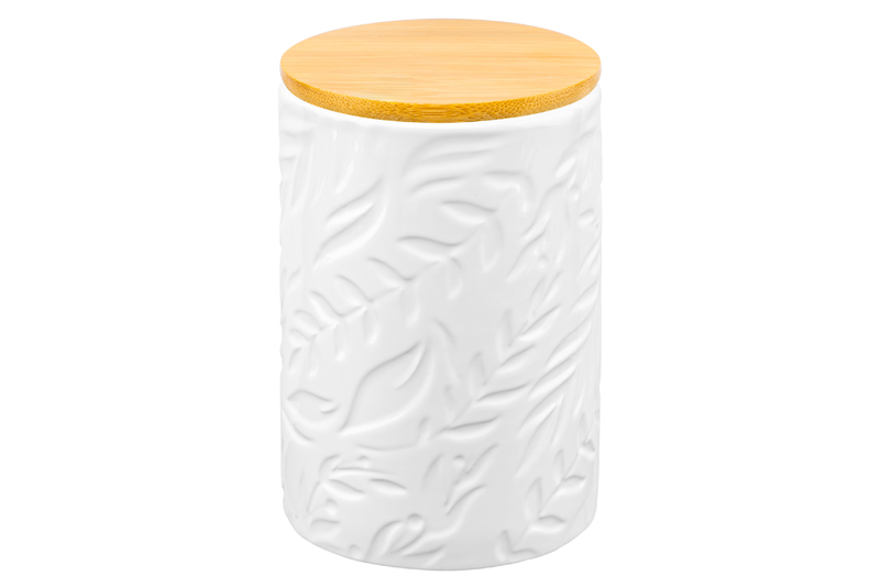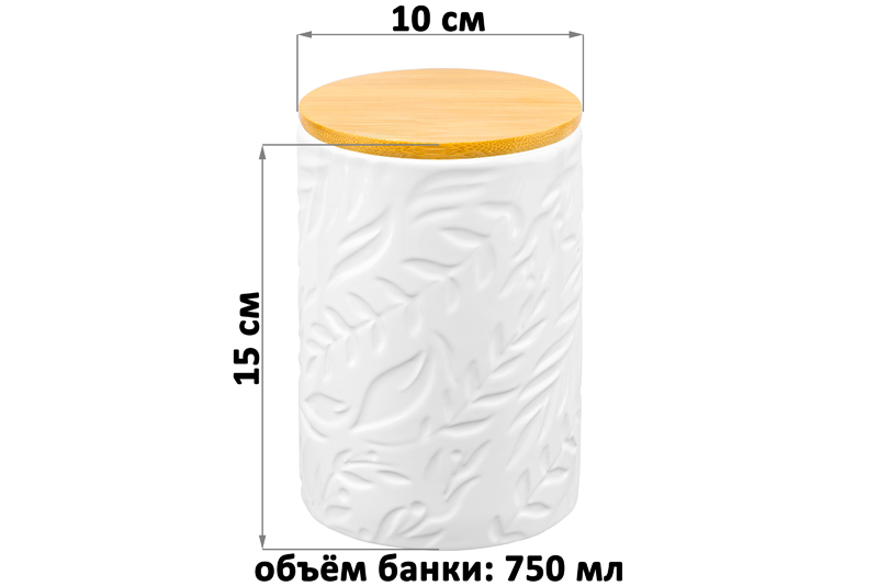 Банка от Elan Gallery предназначена для организации хранения продуктов на вашей кухне. Размер ёмкости – 10х10х15 см, объём – 750 мл. Выполнена из керамики и имеет белый цвет, матовая поверхность украшена рельефным лиственным узором. Крышка выполнена из натурального бамбука и оснащена силиконовым уплотнителем. Изделие отлично подойдёт для хранения сыпучих продуктов: сахара и соли, чая и кофе, приправ и специй. Храните в баночке ягоды, орехи и сухофрукты. Заполните её любимыми сладостями: леденцами, конфетами или печеньем. Подайте к столу, чтобы идеально дополнить чайную сервировку! Герметичная деревянная крышечка защитит ваши продукты от попадания грязи и пыли. Коллекция из двух баночек лаконичных цветов впишется в любой интерьер и позволит организовать хранение даже на открытых полках. Не рекомендуется применять абразивные моющие средства. Не подходит для использования в микроволновой печи. Без бамбуковой крышки подходит для посудомоечной машины. Бамбук нельзя замачивать! Поставляется в дизайнерской картонной коробке – благодаря ей вам не потребуется дополнительная подарочная упаковка. Это идеальный подарок для хозяйки, ценящей не только практичность, но и стиль. В ассортименте бренда Элан Галерея представлены банки для хранения на любой вкус. Соберите целый набор кухонных контейнеров для эстетичного хранения продуктов на вашей кухне!