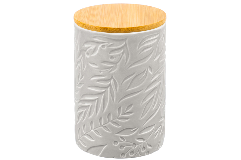 Банка от Elan Gallery предназначена для организации хранения продуктов на вашей кухне. Размер ёмкости – 10х10х15 см, объём – 750 мл. Выполнена из керамики и имеет светло-серый цвет, поверхность украшена рельефным лиственным узором. Крышка выполнена из натурального бамбука и оснащена силиконовым уплотнителем. Изделие отлично подойдёт для хранения сыпучих продуктов: сахара и соли, чая и кофе, приправ и специй. Храните в баночке ягоды, орехи и сухофрукты. Заполните её любимыми сладостями: леденцами, конфетами или печеньем. Подайте к столу, чтобы идеально дополнить чайную сервировку! Герметичная деревянная крышечка защитит ваши продукты от попадания грязи и пыли. Коллекция из трёх баночек нежных природных цветов впишется в любой интерьер и позволит организовать хранение даже на открытых полках. Не рекомендуется применять абразивные моющие средства. Не подходит для использования в микроволновой печи. Без бамбуковой крышки подходит для посудомоечной машины. Бамбук нельзя замачивать! Поставляется в дизайнерской картонной коробке – благодаря ей вам не потребуется дополнительная подарочная упаковка. Это идеальный подарок для хозяйки, ценящей не только практичность, но и стиль. В ассортименте бренда Элан Галерея представлены банки для хранения на любой вкус. Соберите целый набор кухонных контейнеров для эстетичного хранения продуктов на вашей кухне!