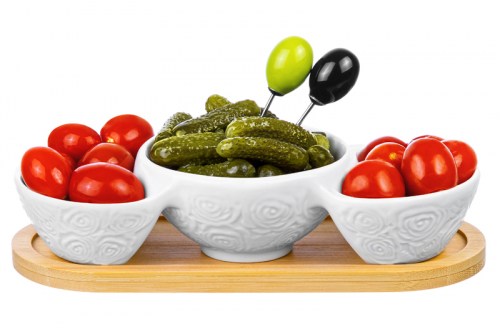 Набор посуды из серии «Розы» от Elan Gallery предназначен для эстетичной сервировки вашего стола. Включает в себя баночку для зубочисток и набор для специй. Общий размер изделия – 19,5х7х6 см, размер каждой ёмкости – 6х6х5 см, объём – 75 мл. Выполнены из высококачественного белого фарфора. Он не впитывает цвет продуктов и легко отмывается, благодаря чему надолго сохраняет свою белизну. Поверхность изделий украшают рельефные узоры в виде пышных бутонов роз. Такое изделие отлично дополнит сервировку стола как для сытного завтрака, так и для уютного чаепития. Заполните ёмкости сахаром и солью, специями и приправами. Подайте их вместе с горячими блюдами, чтобы каждый мог приправить пищу по своему вкусу. Набор для специй позволит держать под рукой необходимые приправы. Наполняются через отверстие снизу и закрываются пластиковой пробкой. Вазочка для зубочисток станет удобной гигиенической принадлежностью. Зубочистки не входят в комплект. Бамбуковая подставка позволит компактно хранить комплект. Не рекомендуется применять абразивные моющие средства. Без деревянной подставки и пластиковых элементов подходят для использования в посудомоечной машине и микроволновой печи. Поставляется в дизайнерской картонной коробке – благодаря ей вам не потребуется дополнительная подарочная упаковка. Фарфоровая сервировочная посуда будет оригинальным подарком для хозяйки, ценящей не только практичность, но и привлекательность. Серия «Розы» от бренда Элан Галерея станет украшением любого кухонного инвентаря и позволит собрать красивый сервиз в едином стиле!