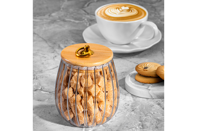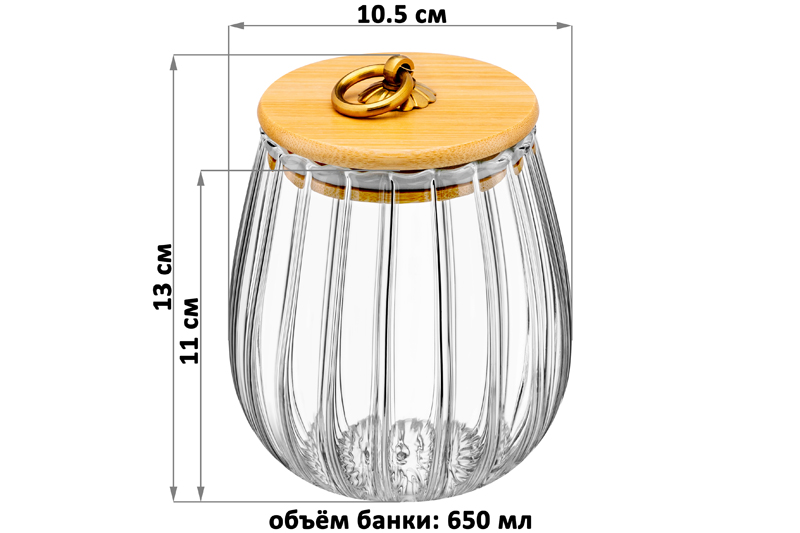 Стеклянная банка объемом 650 мл с крышкой из бамбука и силиконовым уплотнителем поможет организовать хранение сыпучих продуктов на вашей кухне. Размеры баночки – 10,5х10,5х13 см, высота без крышки – 11 см. Прозрачная ёмкость подойдет для чая, кофе, сахара, соли, приправ, специй, круп и орехов. Благодаря силиконовому уплотнителю крышечка плотно прилегает к контейнеру, что предотвратит риск рассыпания продуктов и сохранит их полезные свойства и аромат. Бамбуковая крышка украшена ручкой в виде золотистого кольца, что придает баночке нарядный вид. Декоративная посуда поможет не только навести порядок на вашей кухне, ее стильный дизайн с узором в виде полосок подойдет к любому интерьеру и поможет создать уют. Используйте банку не только для сыпучих продуктов, как красиво будут смотреться в стеклянной емкости конфеты, печенье, мармелад, варенье и другие сладости! Нельзя использовать в СВЧ. Можно мыть в ПММ без крышки (бамбуковую крышку нельзя замачивать). Поставляется в стильной картонной упаковке. Баночка для сыпучих продуктов из стекла – идеальный подарок любой хозяйке, теперь все продукты будут под рукой. Она станет настоящим украшением вашего дома или чудесным подарком для родных и близких!
