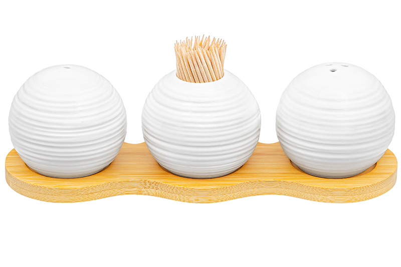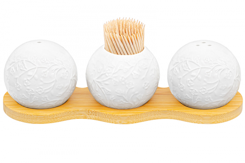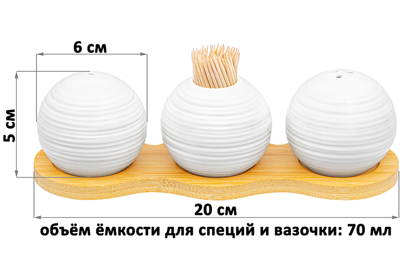 Набор для специй Elan Gallery "Шелк" с вазочкой под зубочистки на бамбуковой подставке выполнен из фарфора. Общий размер набора – 20х6,5х6 см. В комплект входят: вазочка под зубочистки, солонка и перечница. Размер каждой круглой фигурки – 6х6х5 см, объём – 75 мл. Зубочистки поставляются в комплекте. Ёмкости для соли и перца украсят обеденный стол в будни и подойдут для красивой сервировки праздничного стола. Столовые принадлежности можно использовать для хранения соли, перца или приправ. Они позволят держать всё необходимое под рукой в процессе приготовления еды. Баночки выполнены из белого фарфора, который отличается от керамики повышенной плотностью. Фарфоровые контейнеры не впитывают цвет и не деформируются от влаги, чему может быть подвержена керамика. Фигурки наполняются через отверстия внизу, которые закрываются пластиковыми пробками. Баночки без подставки из бамбука можно мыть в ПММ (посудомоечной машине). Бамбук нельзя замачивать! Настольный набор поставляется в стильной картонной упаковке. Красивый кухонный инвентарь оценит любая хозяйка. Декоративный набор для специй станет украшением вашей кухни или приятным подарком на Восьмое марта, Пасху, День Рождения и любой другой праздник. Создайте на вашей кухне атмосферу уюта благодаря красивой посуде для сервировки из фарфора!