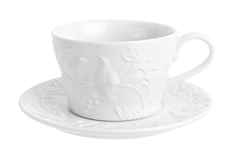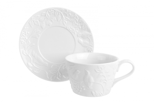 Чайная пара серии "Птички на ветке" состоит из чашки объемом 360 мл и блюдца диаметром 16,5 см. Чашка и блюдце выполнены из высококачественного фарфора и украшены рельефными узорами. Чайная пара подходит для любых напитков, горячих и холодных: чая, кофе, соков, лимонадов. Фарфоровая посуда не впитывает цвет напитков и не деформируется от влаги. Она долгое время будет выглядеть, как новая! Чайную пару можно использовать в микроволновой печи и посудомоечной машине. Набор поставляется в яркой картонной упаковке. Чайная пара из серии посуды "Птички на ветке" сможет стать настоящим украшением кухни или приятным подарком для ваших родных и близких!