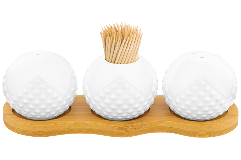 Набор посуды из серии «Ромбики» от Elan Gallery предназначен для эстетичной сервировки вашего стола. Размер изделия – 19,5х7х6 см. Размер каждой ёмкости – 6х6х5 см, объём – 75 мл. Выполнены из высококачественного белого фарфора. Он не впитывает цвет напитков и легко отмывается, благодаря чему надолго сохраняет свою белизну. Поверхность украшена рельефным геометрическим узором. Комплект отлично дополнит сервировку стола как для сытного завтрака, так и для уютного чаепития. Заполните ёмкости солью, специями и приправами. Подайте вместе с горячими блюдами, чтобы каждый мог приправить пищу по своему вкусу. Набор для специй поможет держать под рукой все необходимые приправы. Наполняются через отверстия снизу и закрываются пластиковой пробкой. Вазочка для зубочисток станет удобной гигиенической принадлежностью. Зубочистки не входят в комплект. Бамбуковая подставка поможет компактно хранить набор и эстетично сервировать стол. Не рекомендуется применять абразивные моющие средства. Без бамбуковых и пластиковых деталей подходят для использования в посудомоечной машине и микроволновой печи. Бамбук нельзя замачивать! Поставляется в дизайнерской картонной коробке – благодаря ей вам не потребуется дополнительная подарочная упаковка. Фарфоровая сервировочная посуда будет оригинальным подарком для хозяйки, ценящей не только практичность, но и привлекательность. Серия «Ромбики» от бренда Элан Галерея станет украшением любого кухонного инвентаря и позволит собрать красивый сервиз в едином стиле!
