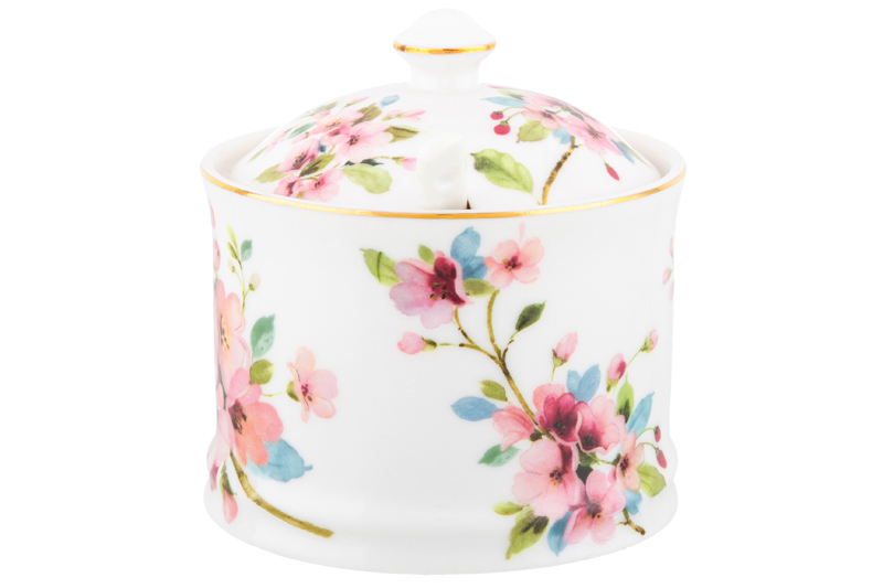 БЫЛО 595 руб! Сахарница 250 мл 9*9*10 см "Яблоневый цвет на белом" + ложка, NEW BONE CHINA