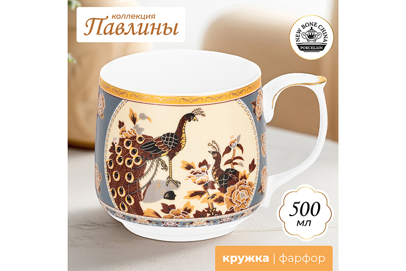 БЫЛО 600 руб! Кружка 500 мл 13,5*10*9 см "Павлин на бежевом" NEW BONE CHINA, фарфор