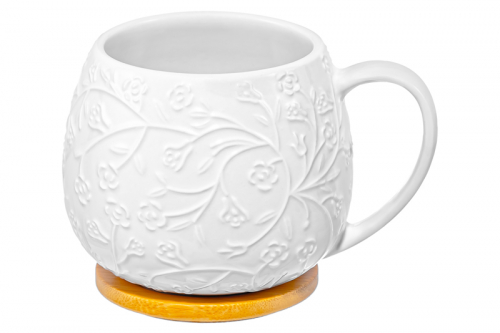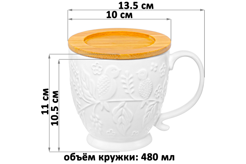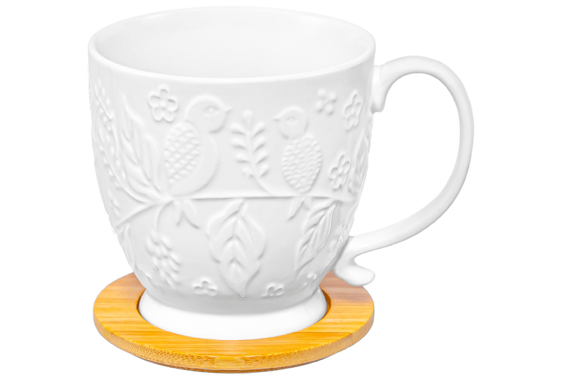 Кружка из серии «Птички на ветке» предназначена для красивой сервировки стола. Размер ёмкости – 13,5х10х11 см, объём – 480 мл. Выполнена из высококачественного белого фарфора, крышка-подставка выполнена из натурального бамбука. Фарфор не впитывает цвет напитков и легко отмывается, благодаря чему надолго сохранит свою белизну. Изделие украшено рельефным узором в виде лиственных веточек, на которых расположились маленькие птички. Кофейная кружка поможет провести множество приятных завтраков с капучино или латте, а также уютные чайные вечера с конфетами, вафлями, другими десертами и сладостями. Подойдёт ценителям чая и кофе, которые любят пить из красивой и необычной посуды. Согрейтесь зимой любимым горячим напитком: какао с маршмэллоу, ягодным чаем, горячим шоколадом. Летом освежитесь домашним лимонадом или морсом. Декоративная кружечка добавит эстетики любому чаепитию. Подставка защитит поверхность от воздействия горячих температур, а в качестве крышки прикроет напитки от попадания пыли. Благодаря этому вы можете брать кружку на природу, на пикник или неторопливо наслаждаться напитками в саду. Не рекомендуется применять абразивные моющие средства. Без бамбуковой подставки подходит для использования в микроволновой печи и посудомоечной машине. Бамбук нельзя замачивать! Поставляется в дизайнерской картонной упаковке – благодаря ей вам не потребуется дополнительная подарочная упаковка. Фарфоровая сервировочная посуда послужит оригинальным подарком для хозяйки, ценящей не только практичность, но и привлекательность. Серия «Птички на ветке» станет украшением любого кухонного инвентаря и позволит собрать сервиз в едином стиле!