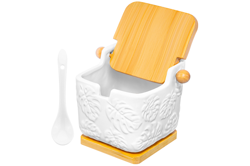 Банка для сыпучих продуктов из серии «Тропики» от Elan Gallery послужит для организации хранения на вашей кухне. Размер ёмкости – 12х9х9,5 см, объём – 300 мл. Выполнена из высококачественного белого фарфора и украшена рельефным узором в виде тропических листьев. Фарфор не впитывает цвет продуктов и легко отмывается, благодаря чему надолго сохранит свою белизну. Откидная крышка и подставка выполнены из бамбука. Изделие отлично подойдёт для хранения сыпучих продуктов: сахара и соли, чая и кофе, приправ и специй. Храните в баночке ягоды, орехи и сухофрукты. Заполните её леденцами, конфетами или печеньем. Подайте баночку к столу, чтобы идеально дополнить чайную сервировку! Герметичная деревянная крышка защитит ваши продукты от попадания грязи и пыли. Баночка впишется в любой интерьер и позволит организовать хранение даже на открытых полках. Не рекомендуется применять абразивные моющие средства. Без крышки подходит для использования в микроволновой печи и посудомоечной машине. Бамбук нельзя замачивать! Поставляется в дизайнерской картонной коробке – благодаря ей вам не потребуется дополнительная подарочная упаковка. Это идеальный подарок для хозяйки, ценящей не только практичность, но и привлекательность. Серия «Тропики» от бренда Elan Gallery станет украшением любого кухонного инвентаря и позволит собрать сервиз в едином стиле!
