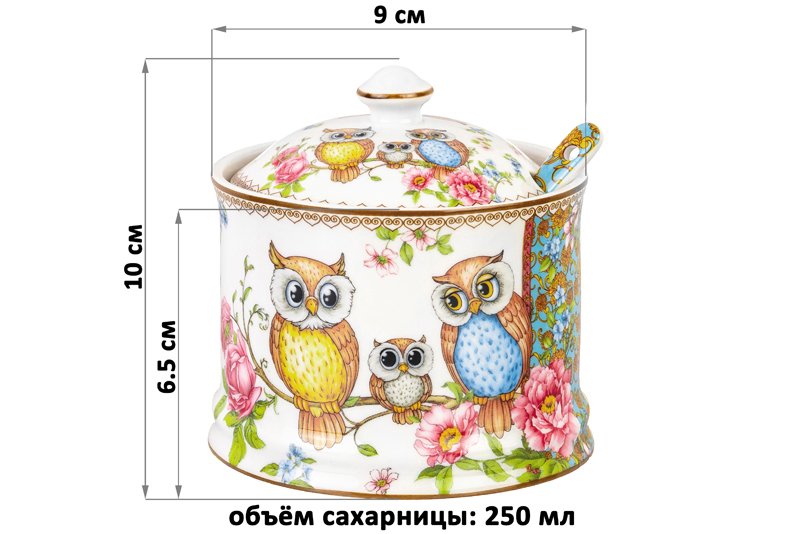 БЫЛО 607 руб! Сахарница 250 мл 9*9*10 см "Совушки" с ложкой, фарфор NEW BONE CHINA