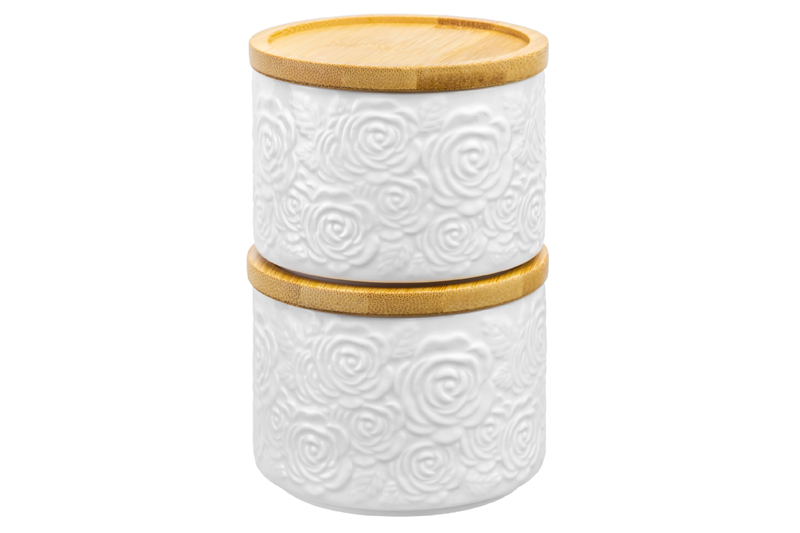 Набор 2 банок из серии «Розы» от Elan Gallery послужит для организации хранения сыпучих продуктов на вашей кухне. Размер каждой ёмкости – 9,3х9,3х7 см, объём – 250 мл. Выполнены из высококачественного белого фарфора. Он не впитывает цвет продуктов и легко отмывается, благодаря чему надолго сохраняет свою белизну. Поверхность изделия украшают рельефные узоры в виде пышных бутонов роз. Крышки выполнены из натурального бамбука и оснащены силиконовыми уплотнителями. Ёмкости подойдут для хранения разнообразных сыпучих продуктов. Заполните их сахаром и солью, специями и приправами, чтобы во время приготовления и приёма пищи всё необходимое было под рукой. Засыпьте внутрь чай или кофе, чтобы в любой момент заварить свежий напиток. Храните в них крупы, ягоды, орехи и сухофрукты. Заполните контейнеры сладостями и закусками: конфетами, леденцами, пряниками или печеньем. Послужат в роли маленьких сервировочных мисочек для соуса и джема. Подайте баночки к столу, чтобы идеально дополнить чайную сервировку! Герметичные бамбуковые крышечки предотвратят попадание пыли и грязи. В качестве подставок они защитят поверхности от воздействия высоких температур. Без крышек фарфоровые изделия можно использовать в качестве жюльенниц и рамеников – форм для запекания порционных блюд и десертов. Порадуйте близких творожной запеканкой, традиционным жюльеном или крем-брюле! Не рекомендуется применять абразивные моющие средства. Без бамбуковых крышек подходят для использования в посудомоечной машине, микроволновой печи и духовом шкафу при температуре до 230 градусов. Бамбук нельзя замачивать! Поставляются в дизайнерской картонной коробке – благодаря ей вам не потребуется дополнительная подарочная упаковка. Фарфоровая сервировочная посуда будет оригинальным подарком для хозяйки, ценящей не только практичность, но и привлекательность. Серия «Розы» от бренда Элан Галерея станет украшением любого кухонного инвентаря и позволит собрать красивый сервиз в едином стиле!