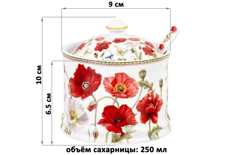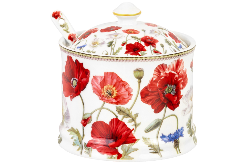 БЫЛО 620 руб! Сахарница 250 мл 9*9*10 см "Маки" + ложка, NEW BONE CHINA