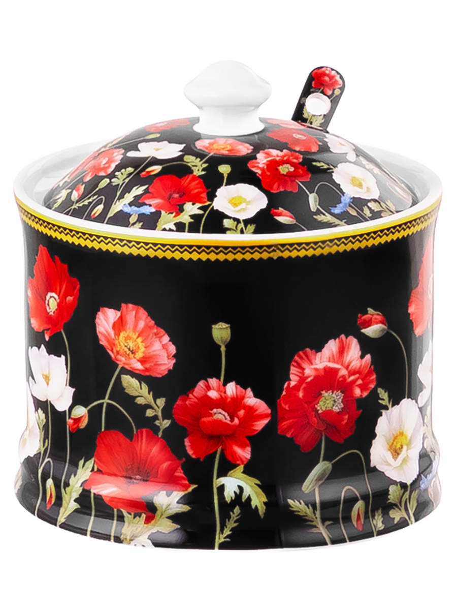 БЫЛО 620 руб! Сахарница 250 мл 9*9*10 см "Маки на черном" + ложка NEW BONE CHINA