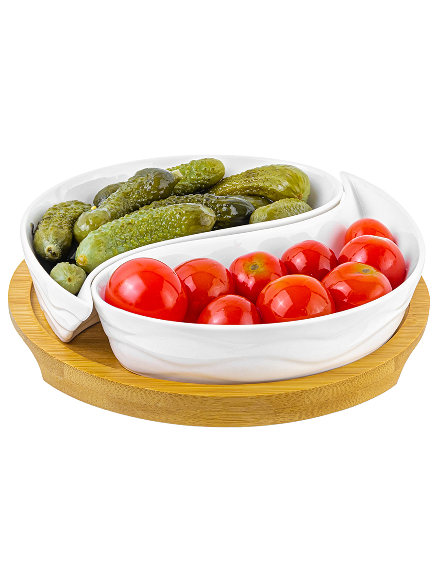 Тарелка под оливки «Инь-Янь» из серии «Айсберг волны» от Elan Gallery подойдёт для эстетичной сервировки вашего стола. Общий размер изделия – 15х15х3,5 см. Размер каждой секции – 14х9х2,5 см, объём – 100 мл. Выполнены из высококачественного белого фарфора. Он не впитывает цвет продуктов и легко отмывается, благодаря чему надолго сохраняет свою белизну. Поверхность изделий украшают рельефные узоры в виде поперечных волн. Подставка выполнена из натурального бамбука. Размер – 15х15х1 см. Менажница поможет красиво подавать маслины, орехи или сыры. Она станет незаменимым элементом праздничных обедов или неторопливых завтраков. Послужит в качестве конфетницы, позволив угостить себя и гостей любимыми сладостями: конфетам, мармеладом, леденцами и безе. Не рекомендуется применять абразивные моющие средства. Без бамбуковой подставки подходит для использования в посудомоечной машине и микроволновой печи. Бамбук нельзя замачивать! Поставляется в дизайнерской картонной коробке – благодаря ей вам не потребуется дополнительная подарочная упаковка. Фарфоровая сервировочная посуда будет оригинальным подарком для хозяйки, ценящей не только практичность, но и привлекательность. Серия «Айсберг волны» от бренда Элан Галерея станет украшением любого кухонного инвентаря и позволит собрать красивый сервиз в едином стиле!
