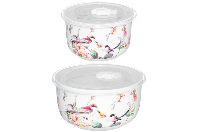 Набор 2 салатников из серии «Певчие птички» от Elan Gallery предназначен для эстетичной сервировки вашего стола. Включает в себя изделия разных размеров: 13,5х13,5х7 см (объём – 500 мл, размер без крышки – 12,5х12,5х6,5 см) и 10,5х10,5х6,5 см (объём – 300 мл, размер без крышки – 10,5х10,5х6,5 см). Выполнены из фарфора нового поколения new bone china, сочетающего в себе изящность и высокую прочность. Такие изделия легко отмываются, поэтому сохраняют привлекательный вид и практичны в использовании. От других видов костяного фарфора new bone china отличается большей экологичностью в производстве. Изделия украшены рисунком пёстрых птичек и пышных бутонов роз. Они выполнены в манере, вдохновлённой акварельным рисунком. Крышки выполнены из пластика и оснащены силиконовыми уплотнителями. Большие глубокие миски станут идеальным вариантом для любителей здорового питания. Используйте их для приготовления и подачи салатов, а также для сервирования овощей и фруктов. Кроме того, они подойдут для холодных закусок и гарниров, разнообразных сладостей и десертов. Задействуйте в качестве конфетниц для организации уютного чаепития. Герметичные крышки надёжно защитят продукты от попадания грязи и пыли и позволят хранить готовые блюда в холодильнике. Благодаря нежному дизайну изделия впишутся в интерьер любой кухни, гостиной или столовой. Не рекомендуется применять абразивные моющие средства. Можно мыть в посудомоечной машине. С открытым клапаном на крышке можно использовать в микроволновой печи. Без крышки можно использовать в духовом шкафу при температуре до 230 градусов. Поставляются в дизайнерской картонной коробке – благодаря ей вам не потребуется дополнительная подарочная упаковка. Фарфоровая сервировочная посуда будет оригинальным подарком для хозяйки, ценящей не только практичность, но и привлекательность. Серия «Певчие птички» от бренда Элан Галерея подарит вам ощущение мечтательной лёгкости!