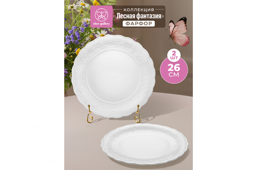Набор 2 тарелок Elan Gallery "Лесная фантазия" выполнен из белого фарфора. Размер каждого изделия — 18,5х18,5х1,5 см. Имеют волнистые края. Коллекция посуды "Лесная фантазия" украшена изящным рельефным узором в виде цветов и порхающих бабочек. Она навевает фантазии о лесной поляне — благоухающей и согретой лучами солнца. Тарелочки в классическом стиле подойдут к любому интерьеру кухни или гостиной. Можно использовать как десертные или для вторых блюд. Положите на сервировочное блюдце кусочек торта, домашнего пирога или пирожное. Небольшая тарелочка подойдёт для подачи закусок: сырной нарезки, сырокопчёной колбасы или свежих овощей и зелени. Разместите на блюде выпечку и сыр, чтобы перекусить за чашечкой кофе на завтрак. Фарфоровая посуда отличается от керамической повышенной плотностью. Фарфор не впитывает цвет продуктов и не деформируется от влаги, чему может быть подвержена керамика. Каждое блюдечко легко отмывается и долго сохраняет привлекательный вид. Не рекомендуется применять абразивные моющие средства. Беречь от резких перепадов температур и механических повреждений. Можно использовать в микроволновой печи и мыть в посудомоечной машине. Комплект поставляется в стильной картонной коробке. Станет прекрасным подарком на любой праздник. Благодаря стильной коробочке не понадобится дополнительная подарочная упаковка! Красивые блюдца восхитят ваших гостей и добавят элегантности при сервировке стола как в будни, так и на праздник. В коллекции бренда Элан Галерея можно найти много красивого кухонного и столового инвентаря, а также собрать сервиз на свой вкус. Коллекция "Лесная фантазия" от Elan Gallery наполнит повседневные моменты лёгкостью и сказочной атмосферой, а также позволит создать красивую сервировку праздничного стола!