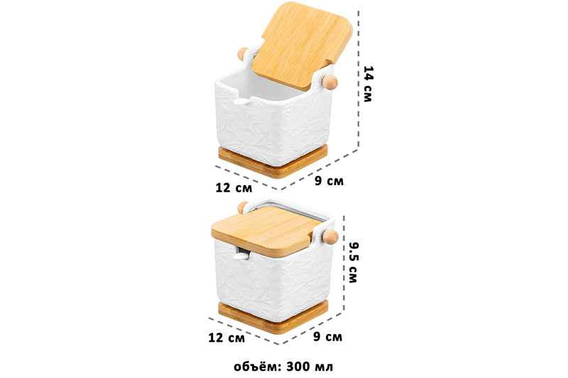 Банка из серии «Веточки-цветочки» от Elan Gallery послужит для организации хранения сыпучих продуктов на вашей кухне. Размер ёмкости – 12х9х9 см, объём – 300 мл. Выполнена из высококачественного белого фарфора. Он не впитывает цвет продуктов и легко отмывается, благодаря чему надолго сохраняет свою белизну. Поверхность изделия украшают рельефные узоры в виде лиственных веточек с аккуратными цветочными бутончиками. Откидная крышка и подставка выполнены из натурального бамбука. Размер подставки – 8х8х1 см. Ёмкость подойдёт для хранения разнообразных сыпучих продуктов. Заполните её сахаром, солью, а также другими специями и приправами, чтобы во время приготовления и приёма пищи всё необходимое было под рукой. Засыпьте внутрь чай или кофе, чтобы в любой момент заварить свежий напиток. Храните в ней крупы и макаронные изделия, ягоды, орехи и сухофрукты. Заполните контейнер сладостями: конфетами, леденцами, пряниками или печеньем. Подайте баночку к столу, чтобы идеально дополнить чайную сервировку! Герметичная бамбуковая крышечка защитит ваши продукты от попадания грязи и пыли. Ложечка поможет вам набрать необходимое количество продуктов и компактно помещается в баночке. Не рекомендуется применять абразивные моющие средства. Не подходит для использования в посудомоечной машине и микроволновой печи. Бамбук нельзя замачивать! Поставляется в дизайнерской картонной коробке – благодаря ей вам не потребуется дополнительная подарочная упаковка. Фарфоровая сервировочная посуда будет оригинальным подарком для хозяйки, ценящей не только практичность, но и привлекательность. Серия «Веточки-цветочки» от бренда Элан Галерея станет украшением любого кухонного инвентаря и позволит собрать красивый сервиз в едином стиле!