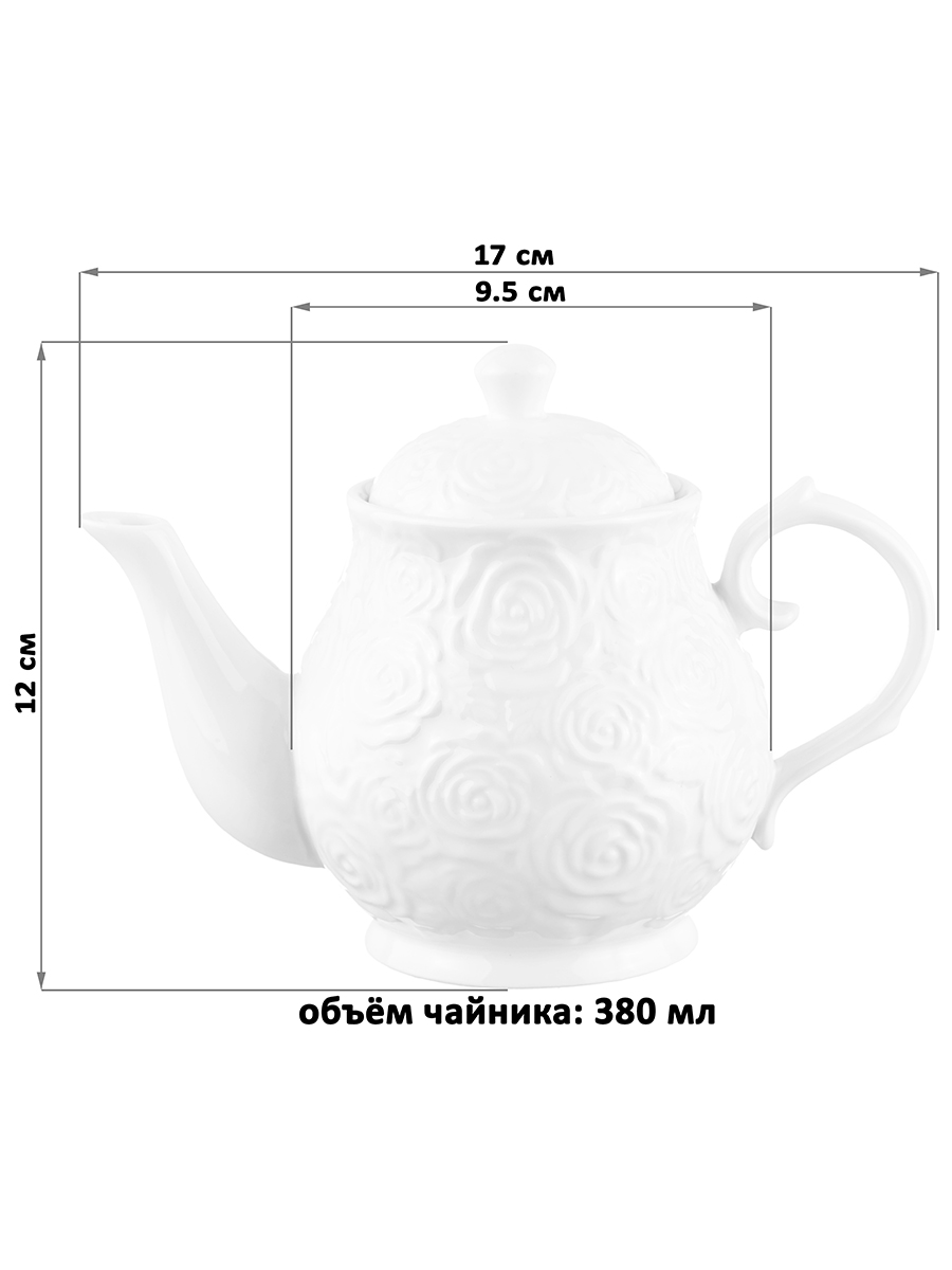Чайник из серии «Розы» от Elan Gallery предназначен для эстетичной сервировки вашего стола. Размер ёмкости – 17х9,5х12 см, объём – 380 мл. Выполнен из высококачественного белого фарфора. Он не впитывает цвет напитков и легко отмывается, благодаря чему надолго сохраняет свою белизну. Поверхность изделия украшают рельефные узоры в виде пышных бутонов роз. Декоративный чайничек подходит для ежедневного заваривания и станет незаменимой составляющей любого чаепития. Поможет отпраздновать Широкую Масленицу со вкусом! Масленица – это чудесный повод собраться за праздничным столом и насладиться тёплой атмосферой и традиционной русской кухней. Фильтр в виде маленьких отверстий в стенке позволит наслаждаться ароматной заваркой без попадания мелких чаинок. Подайте заварочник к столу, чтобы насладиться чаем с конфетами, шоколадом и другими сладостями. Он привнесёт эстетику в организацию чайной церемонии. Лаконичный дизайн впишет чайник в интерьер любой кухни, столовой или гостиной. Не рекомендуется применять абразивные моющие средства. Подходит для использования в микроволновой печи и посудомоечной машине. Поставляется в дизайнерской картонной коробке – благодаря ей вам не потребуется дополнительная подарочная упаковка. Фарфоровая сервировочная посуда станет оригинальным подарком для хозяйки, ценящей не только практичность, но и привлекательность. В ассортименте бренда Elan Gallery вы найдёте предметы декора и красивую посуду для приготовления и сервировки масленичных блюд. Пусть Масленичная неделя принесет вам радость и множество вкусных моментов!
