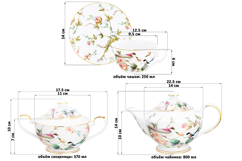 Чайный сервиз "Певчие птички" состоит из 14 предметов: заварочный чайник 800 мл, сахарница 370 мл с ручками и 6 чайных пар с чашками и блюдцами. Объём каждой чашки 250 мл, диаметр каждого блюдца 14 см. Большой набор для чая на 6 персон станет незаменимой вещью для семейного чаепития или сервировки праздничного стола. Можно использовать как кофейный. Выполнен из фарфора нового поколения new bone china, украшен нежным рисунком и золотым кантом. Заварочный чайник оснащен фильтром в виде маленьких отверстий в стеночке, благодаря которому вы сможете наслаждаться ароматной заваркой без попадания мелких чаинок. На фарфоровой крышке с обратной стороны есть язычок, чтобы она хорошо держалась на чайнике. Чайничек станет украшением кухни и незаменимым помощником для организации чайных церемоний! Сахарницу можно использовать не только под сахар, но и как баночку с крышкой для меда и варенья. Тарелочки подойдут в роли подставок под чашки для изящной сервировки, либо для подачи десерта. Положите на десертные тарелки кусочки торта, пирога или закуски, чтобы порадовать гостей. Фарфоровая посуда отличается от керамики повышенной плотностью. Фарфор не впитывает цвет чая и кофе, чему может быть подвержена керамическая посуда, поэтому легче отмывается. Не применять абразивные моющие средства. Из-за золотистого окаймления нельзя использовать в микроволновой печи и посудомоечной машине. Чайные принадлежности станут чудесным подарком на юбилей, годовщину свадьбы и даже без повода! Подарите комплект маме, бабушке или любому другому ценителю классики на Новый год или день рождения. Поставляется в подарочном боксе. Благодаря красивой коробке вам не понадобится дополнительная упаковка, чтобы преподнести сюрприз на праздник! В коллекции нашего бренда представлено много товаров для создания уюта в доме на любой вкус. Комплект украсит вашу кухню или столовую, а также поможет провести множество уютных вечеров с любимыми напитками!