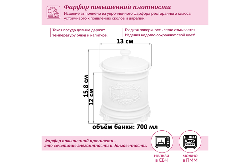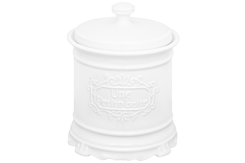 Фарфоровая банка из серии «Галант» поможет организовать хранение продуктов на вашей кухне. Размер ёмкости – 13х13х15,8 см, объём – 700 мл. Выполнена из высококачественного белого фарфора и украшена рельефными узорами, в том числе объёмной надписью «Une petite boîte» («Маленькая баночка»). За счёт силиконовых уплотнителей крышка обеспечит герметичность закрывания и целостность содержимого. Фарфор не впитывает цвет продуктов и надолго сохранит свою нежную белизну. Изделие дополнит любой интерьер и привнесёт в ваш дом атмосферу французской утончённости. Отлично подойдёт для хранения разнообразных сыпучих продуктов: чая, кофе, сахара и соли, приправ и специй. Храните в нём крупы и макаронные изделия, а также ягоды, орехи и сухофрукты. Заполните контейнер поштучными сладостями, например, конфетами или круглым печеньем. Подайте баночку к столу, чтобы идеально дополнить чайную сервировку! Благодаря компактному размеру ёмкость найдёт место в любом шкафу и на любой полке. Не рекомендуется применять абразивные моющие средства. Подойдёт для использования в посудомоечной машине и микроволновой печи. Поставляется в красивой картонной коробке – благодаря ей вам не потребуется дополнительная подарочная упаковка. Это идеальный подарок для хозяйки, ценящей не только практичность, но и стиль. Фарфоровая коллекция «Галант» позволит создать сервировку, как в лучших домах Парижа!