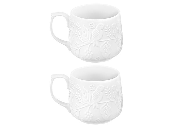 Набор 2 кружек Elan Gallery "Птички на ветке" выполнен из фарфора. Размер каждого изделия 13,5х10х9 см, объём – 500 мл, размер дна – 7 см. Фарфоровые изделия украшены рельефным узором с птицами и лиственными веточками. Каждая кружечка подходит ценителям чая и кофе, которые любят пить из красивой и необычной посуды. Это отличный вариант для того, чтобы согреться горячим какао зимой и освежиться прохладным лимонадом летом. Интересный бокал украсит ваш стол своим стильным дизайном как на праздник, так и в будни. Пейте молоко или кефир и наслаждайтесь изящным рельефом! В офисе станет незаменимым предметом для чаепития или перерыва на капучино и латте. Не рекомендуется применять абразивные моющие средства. Можно использовать в микроволновой печи и мыть в посудомоечной машине. Поставляется в картонной коробке. Фарфоровая посуда станет чудесным подарком на любой праздник. Благодаря стильной коробочке вам не понадобится дополнительная подарочная упаковка. Наслаждайтесь любимыми напитками из этого комплекта сами, либо сделайте сюрприз своим близким! Коллекция "Птички на ветке" позволит собрать чайный или кофейный сервиз в едином стиле и станет украшением вашего дома.