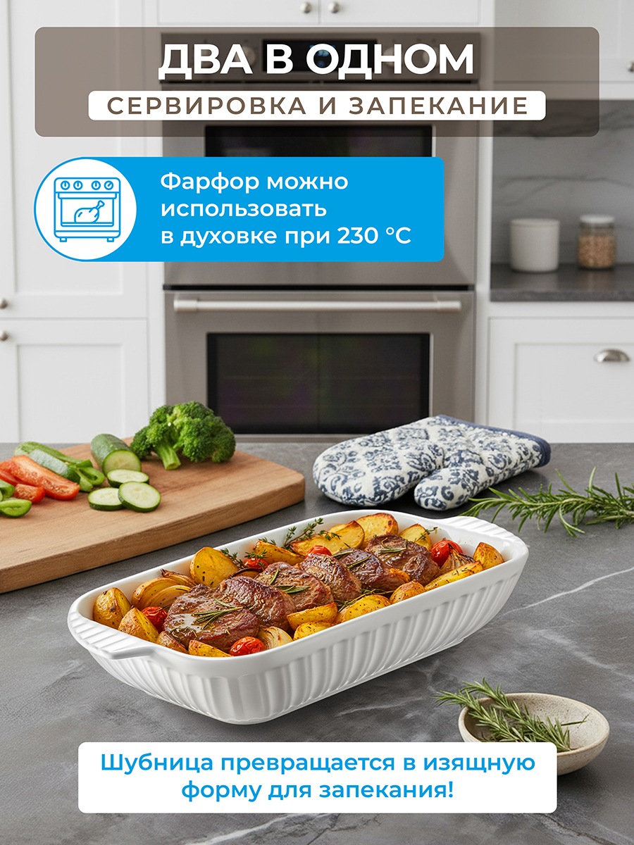 Шубница из серии «Ампир» от Elan Gallery предназначена для эстетичной сервировки вашего стола. Размер изделия – 28,5х15х5,5 см, объём – 1 литр. Внутренний размер по верху – 23,5х14х4,5 см. Выполнена из высококачественного белого фарфора. Он не впитывает цвет продуктов и легко отмывается, благодаря чему надолго сохранит свою белизну. Поверхность изделия украшает элегантный ребристый рельеф. Вместительная ёмкость подойдёт для селёдки под шубой, холодца и плова. Глубокое блюдо с фигурными ручками позволит вам эстетично преподнести угощения из рыбы и мяса. Порадуйте себя большой порцией шашлыка или лапши, разложите суши и роллы, бутерброды и фруктовую нарезку. Выложите нарезанные яйца, сыр и другие закуски, чтобы за большим столом каждому досталось любимое угощение. Заполните большую ёмкость разнообразной выпечкой и сладостями: вафлями, мармеладом, пряниками, шоколадом и печеньем, – дополните семейное чаепитие. Создайте композицию из конфет, ягод, кексов и сухофруктов, чтобы удивить гостей своей кулинарной фантазией. Не рекомендуется применять абразивные моющие средства. Подходит для использования в посудомоечной машине, микроволновой печи и духовом шкафу при температуре до 230 градусов. Поставляется в дизайнерской картонной коробке – благодаря ей вам не потребуется дополнительная подарочная упаковка. Фарфоровая сервировочная посуда будет оригинальным подарком для хозяйки, ценящей не только практичность, но и привлекательность. Серия «Ампир» от бренда Элан Галерея станет украшением любого кухонного инвентаря и позволит собрать красивый сервиз в едином стиле!