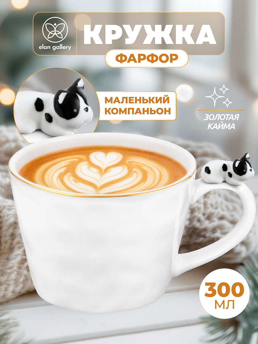 Кружка «Бульдог» от Elan Gallery предназначена для эстетичной сервировки вашего стола. Размер изделия – 14х10х7,5 см, объём – 300 мл. Высота кружки с фигуркой – 9,5 см. Фигурка не съёмная! Выполнена из высококачественного белого фарфора. Он не впитывает цвет напитков и легко отмывается, благодаря чему надолго сохраняет свою белизну. Изделие украшено золотистой каймой. На ручке изделия сидит крошечная очаровательная чёрно-белая собачка. Кофейная кружка поможет провести множество приятных завтраков с капучино и латте, а также уютные чайные вечера с конфетами, вафлями, другими десертами и сладостями. Подойдёт ценителям чая и кофе, которые любят пить из красивой и необычной посуды. Согрейтесь зимой любимым напитком: какао с маршмэллоу, ягодным чаем или горячим шоколадом. Летом освежитесь домашним лимонадом или морсом. Не рекомендуется применять абразивные моющие средства. Не подходит для использования в посудомоечной машине и микроволновой печи. Поставляется в картонной коробке – благодаря ей вам не потребуется дополнительная подарочная упаковка. Фарфоровая сервировочная посуда будет оригинальным подарком для хозяйки, ценящей не только практичность, но и привлекательность. Кружка с милым зверьком от бренда Элан Галерея подарит вам неповторимые эмоции. Насладитесь чашкой любимого напитка вместе с новым другом!