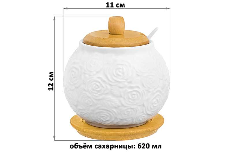Сахарница из серии «Розы» от Elan Gallery предназначен для красивой сервировки вашего стола. Размер ёмкость – 11х11х12 см, объём – 620 мл. Выполнена из высококачественного белого фарфора. Он не впитывает цвет продуктов и легко отмывается, благодаря чему надолго сохраняет свою белизну. Поверхность изделия украшают рельефные узоры в виде пышных бутонов роз. Крышка и подставка выполнены из натурального бамбука. Декоративная баночка добавит особого шарма вашему кухонному инвентарю. Ёмкость подойдёт для хранения не только сахара, но и соли, специй и приправ. Засыпьте внутрь чай или кофе, чтобы в любой момент заварить свежий напиток. Подайте её вместе с горячими блюдами, чтобы каждый мог приправить пищу по своему вкусу. Эстетичную ёмкость можно также приспособить под варенье, мёд или икру. Маленькая ложечка позволит удобно набрать необходимое количество продуктов. Она компактно помещается в баночке благодаря выемке на крышке. Такое изделие отлично дополнит сервировку стола как для сытного завтрака, так и для уютного чаепития. Не рекомендуется применять абразивные моющие средства. Без бамбуковой крышки и подставки подходит для использования в посудомоечной машине и микроволновой печи. Бамбук нельзя замачивать! Поставляется в дизайнерской картонной коробке – благодаря ей вам не потребуется дополнительная подарочная упаковка. Фарфоровая сервировочная посуда будет оригинальным подарком для хозяйки, ценящей не только практичность, но и привлекательность. Серия «Розы» от бренда Элан Галерея станет украшением любого кухонного инвентаря и позволит собрать красивый сервиз в едином стиле!