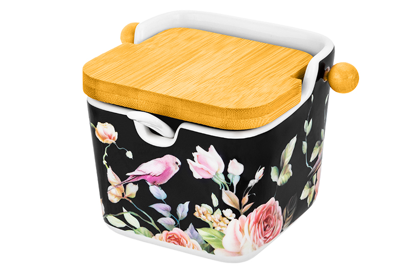 Банка для сыпучих продуктов с фарфоровой ложкой Elan Gallery "Певчие птички на чёрном" объёмом 250 мл и размером 12х9,5х9 см выполнена из фарфора нового поколения new bone china. Материал сочетает в себе изящность и высокую прочность. От костяного фарфора отличается большей экологичностью в производстве. Размер ложечки 13 см. Ёмкость украшена изображениями птичек и розовых цветов на чёрном фоне. Баночка имеет откидную крышку из натурального бамбука. Фарфоровая ёмкость станет удобным и эстетичным дополнением вашей кухни. Она позволит не просто хранить сахар или соль, но и станет элементом её декора. Удобно использовать для праздничной сервировки красной икры в роли икорницы. Подойдёт для разных сладостей, например, варенья, мёда или джема. Кухонная баночка с откидной бамбуковой крышечкой украсит интерьер любой столовой. Это универсальная посуда, ведь её можно приспособить в роли сахарницы, солонки и даже медовницы. Можно насыпать в неё специи и приправы, тогда в процессе приготовления пищи всё будет под рукой. Не рекомендуется применять абразивные моющие средства. Нельзя использовать в микроволновой печи и посудомоечной машине. Бамбук нельзя замачивать! Поставляется в стильной картонной коробке. Станет приятным подарком на любой праздник. Благодаря красивой коробочке вам не понадобится дополнительная подарочная упаковка. Банка с красивым дизайном станет украшением вашей кухни и обеспечит быстрый доступ к крупам, сыпучим продуктам или сладким лакомствам. В коллекции бренда Элан Галерея представлено много функциональных товаров для дома, в том числе кухонного инвентаря. Выберите варианты на свой вкус!