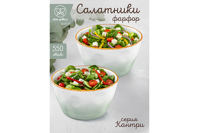 Набор 2 салатников из серии «Кантри» от Elan Gallery предназначен для эстетичной сервировки вашего стола. Размер каждого изделия – 13,5х13,5х7,5 см, объём – 550 мл. Выполнены из высококачественного белого фарфора. Он не впитывает цвет напитков и легко отмывается, благодаря чему надолго сохраняет свою белизну. Салатники имеют необычную геометрию и основание нежного голубого цвета. Окантовка имитирует натуральный древесный узор. Серия «Кантри» – это близость к природе, спокойствие и уют. Она подойдёт тем, кто хочет отдохнуть от ритма современной жизни и вернуться к неспешности и размеренности. Большие глубокие миски станут идеальным вариантом для любителей здорового питания. Используйте их для приготовления и подачи салатов, а также для сервировки овощей и фруктов. Кроме того, они подойдут для холодных закусок и гарниров, разнообразных сладостей и десертов. Задействуйте в качестве конфетниц для организации уютного чаепития. Не рекомендуется применять абразивные моющие средства. Подходят для использования в посудомоечной машине и микроволновой печи. Поставляются в дизайнерской картонной коробке – благодаря ей вам не потребуется дополнительная подарочная упаковка. Фарфоровая коллекция «Кантри» от бренда Элан Галерея позволит вам собрать необычный сервиз в едином стиле!