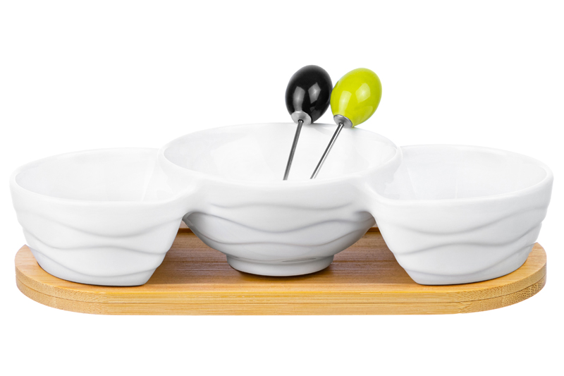 Менажница из серии «Айсберг волны» от Elan Gallery предназначена для эстетичной сервировки вашего стола. Размер изделия – 22х9,5х5,8 см. Объём маленьких секций – 70 мл каждая, объём большой секции – 150 мл. Выполнена из высококачественного белого фарфора. Он не впитывает цвет продуктов и легко отмывается, благодаря чему надолго сохраняет свою белизну. Поверхность изделия украшают рельефные узоры в виде поперечных волн. Подставка выполнена из бамбука, шпажки выполнены из металла. Менажница поможет красиво подавать маслины, орехи или сыры. Она станет незаменимым элементом праздничных обедов или неторопливых завтраков. Послужит в качестве конфетницы, позволив угостить себя и гостей любимыми сладостями: конфетами, мармеладом, леденцами или безе. Металлические шпажки помогут вам взять угощение. Без бамбуковой подставки и шпажек подходит для использования в посудомоечной машине и микроволновой печи. Бамбук нельзя замачивать! Поставляются в дизайнерской картонной коробке – благодаря ей вам не потребуется дополнительная подарочная упаковка. Фарфоровая сервировочная посуда будет оригинальным подарком для хозяйки, ценящей не только практичность, но и привлекательность. Серия «Айсберг волны» от бренда Элан Галерея станет украшением любого кухонного инвентаря и позволит собрать красивый сервиз в едином стиле!