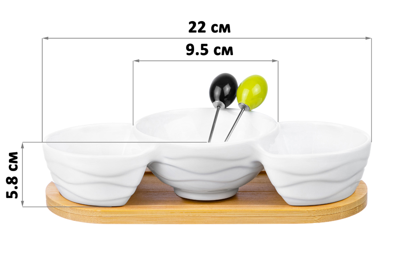 БЫЛО 703 руб! Менажница 22*9,5*5,8 см "Айсберг волны" цельная глубокая 3 секции + 2 шпажки + дерев. подставка