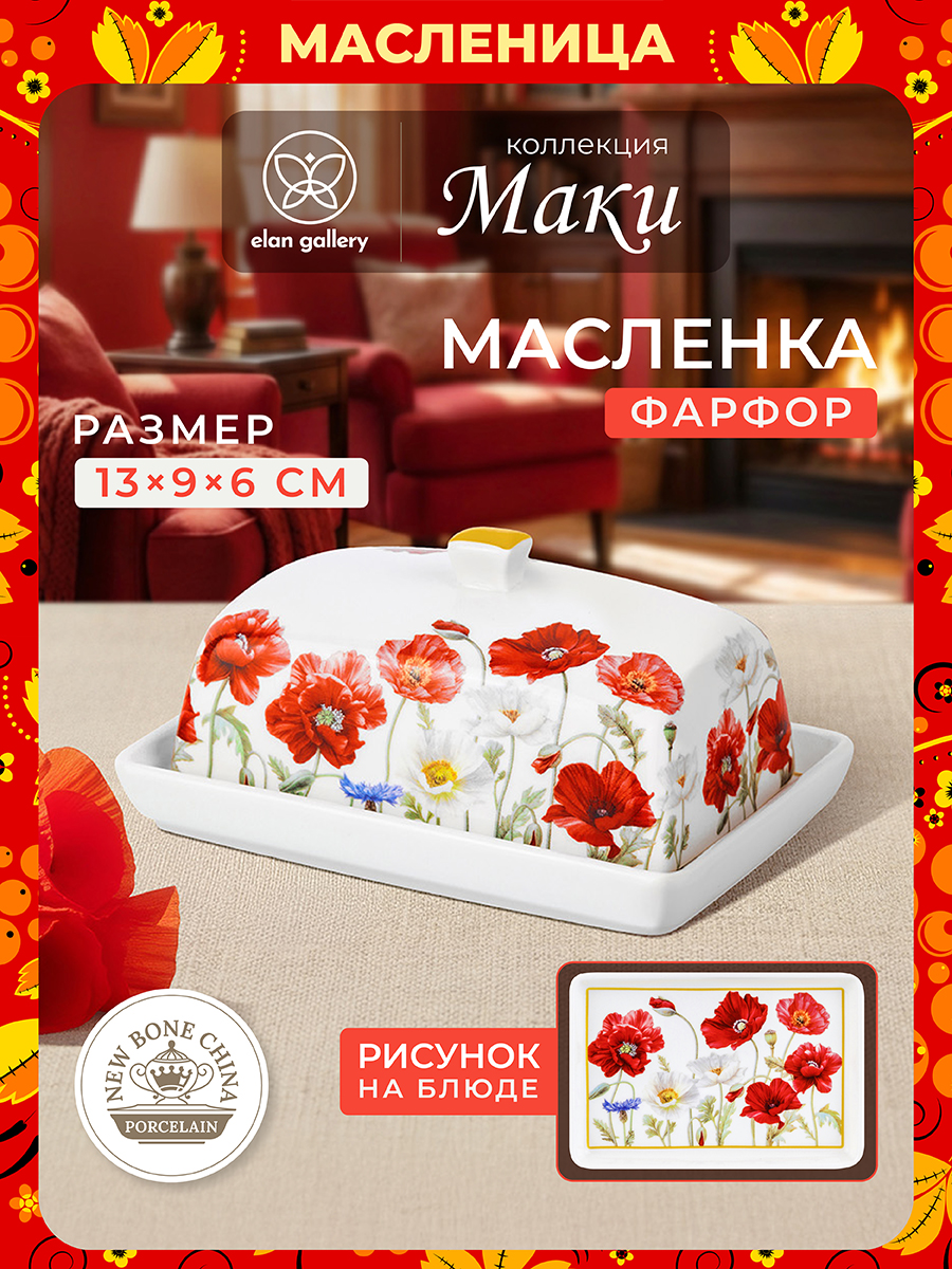 Масленка с крышкой серии "Маки" 13,5х9х6,5 см выполнена из фарфора нового поколения new bone china. New bone china сочетает в себе изящность и высокую прочность. Плотная структура материала позволяет посуде дольше сохранять температуру продуктов. От других видов костяного фарфора отличается большей экологичностью в производстве. Поможет отпраздновать Широкую Масленицу со вкусом! Масленица – это чудесный повод собраться за праздничным столом и насладиться тёплой атмосферой и традиционной русской кухней. В ассортименте бренда Elan Gallery вы найдёте предметы декора и красивую посуду для приготовления и сервировки масленичных блюд. Пусть Масленичная неделя принесет вам радость и множество вкусных моментов! Серия "Маки" украшена красочным принтом с крупными цветами. Изображение красных и белых маков на фарфоре добавит ярких красок вашей кухне. Фарфоровое изделие создано для эстетичной подачи масла на стол во время завтрака или чаепития. При хранении в холодильнике сливочное масло не будет впитывать запахи других продуктов благодаря крышке. В фарфоровую ёмкость помещается кусок масла 10х5,5 см. Масленка сохранит его натуральный запах и насыщенный вкус. Можно использовать в роли контейнера для кусочков сыра. Не рекомендуется применять абразивные моющие средства. Можно мыть в посудомоечной машине. Поставляется в стильной коробке. Станет чудесным подарком на любой праздник. Благодаря красочной коробочке не понадобится подарочная упаковка. В ассортименте бренда Elan Gallery представлено много стильных товаров для создания комфорта и уюта в доме, в том числе красивых кухонных принадлежностей. Выберите варианты на свой вкус!