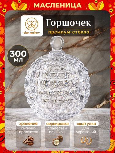 Горшочек для мёда “Пузырьки” с крышкой выполнен из стекла и украшен декоративным рельефным узором. Размер изделия – 11х11х13,5 см, объём – 300 мл. Высота без крышки – 7 см. Интересная прозрачная баночка подойдёт для хранения мёда, варенья, сахара и соли. Можно использовать её как ёмкость для чая, кофе и других сыпучих продуктов. Поможет отпраздновать Широкую Масленицу со вкусом! Масленица – это чудесный повод собраться за праздничным столом и насладиться тёплой атмосферой и традиционной русской кухней. В ассортименте бренда Elan Gallery вы найдёте предметы декора и красивую посуду для приготовления и сервировки масленичных блюд. Пусть Масленичная неделя принесет вам радость и множество вкусных моментов! Декоративная баночка круглой формы станет гармоничным дополнением при сервировке вашего стола как в будни, так и на праздник. Красивый дизайн позволит использовать её не только для хранения продуктов, но и для подачи на стол. Положите в неё конфеты или икру, чтобы удивить гостей изящной сервировкой. Стеклянную ёмкость с крышечкой можно использовать не только как сахарницу, икорницу или соусник, но и для специй и приправ. Это позволит держать под рукой всё необходимое во время приготовления и приёма пищи. На даче медовница будет незаменимой для семейного чаепития, а также подойдёт для подачи ягод. В качестве альтернативы красивую вазочку с крышкой можно использовать как шкатулку. Сложите в неё украшения и любые маленькие предметы. Не рекомендуется применять абразивные моющие средства. Можно мыть в посудомоечной машине. Нельзя использовать в микроволновой печи. Поставляется в стильной картонной упаковке. Красивая посуда – это отличный подарок на любой праздник. Медовый бочонок “Пузырьки” станет многофункциональным дополнением вашего кухонного инвентаря и настоящим украшением кухни!