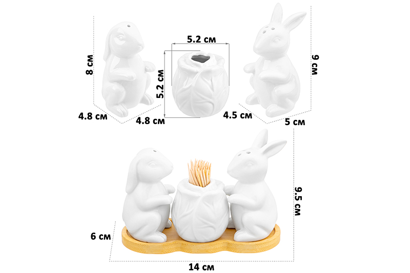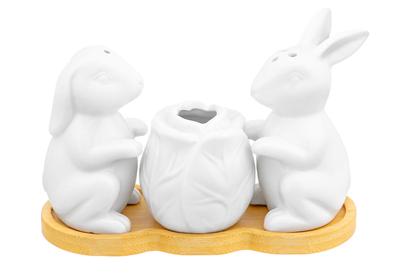 БЫЛО 730 руб! Набор д/специй 3 пр. 14*6*9,5 см "Кролики с капустой" на дер. подставке+зубочистки