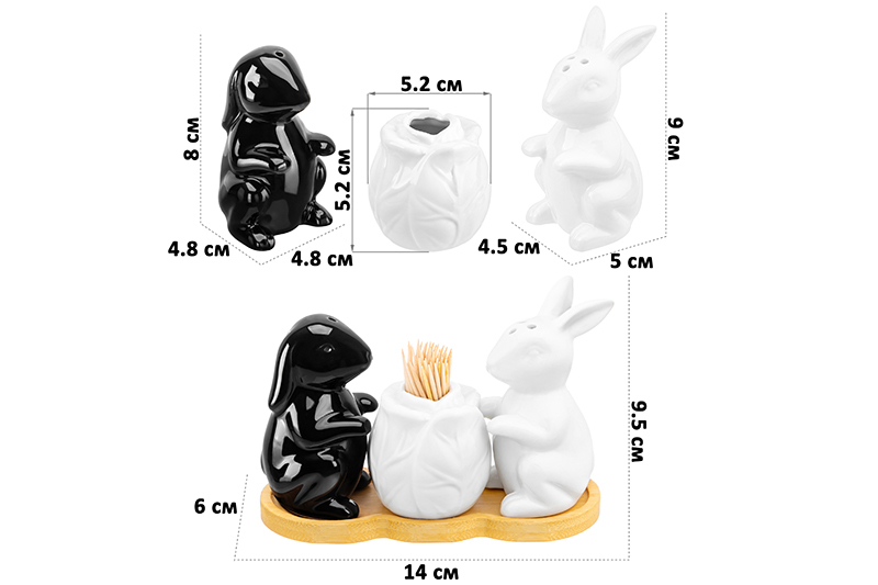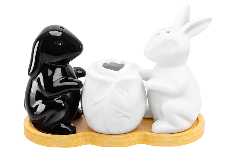 БЫЛО 730 руб! Набор д/специй 3 пр. 14*6*9,5 см "Кролики с капустой" на дер. подставке+зубочистки,бел/черн