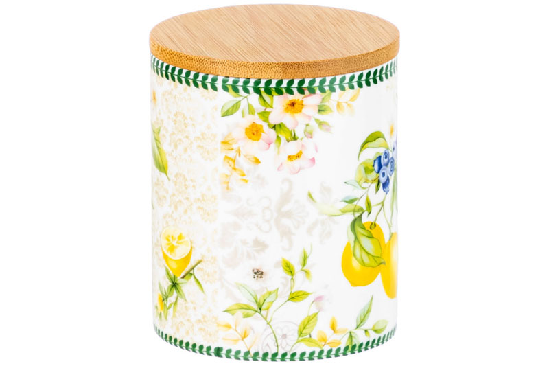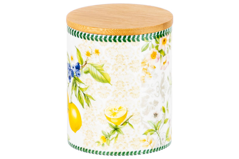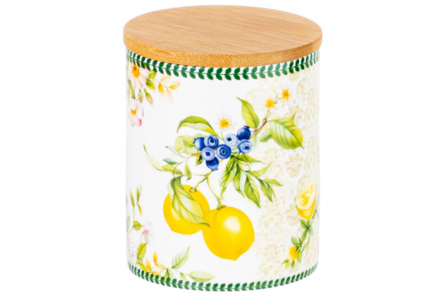 БЫЛО 731 руб! Банка д/хранения 650 мл 10*10*12,5 см "Лимоны" с деревянной крышкой с силикон.уплотн. NEW BONE CHINA