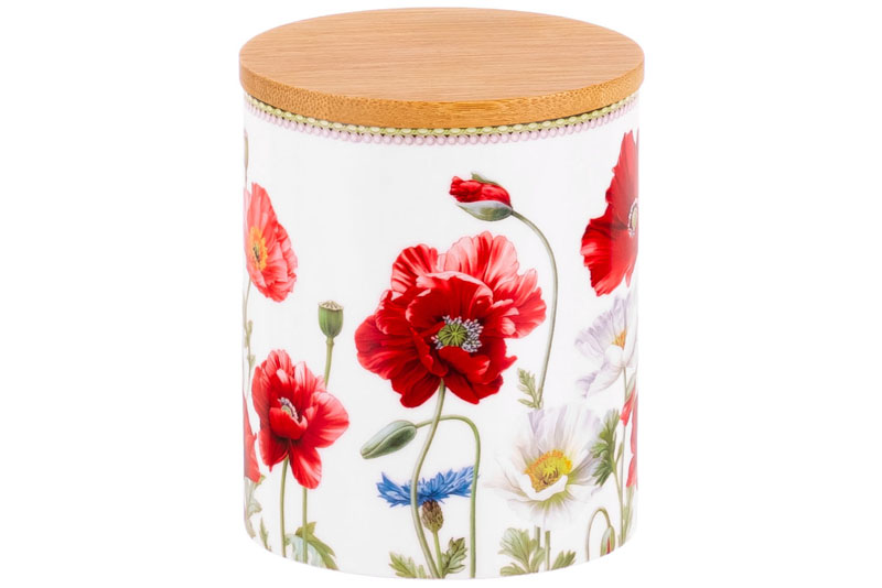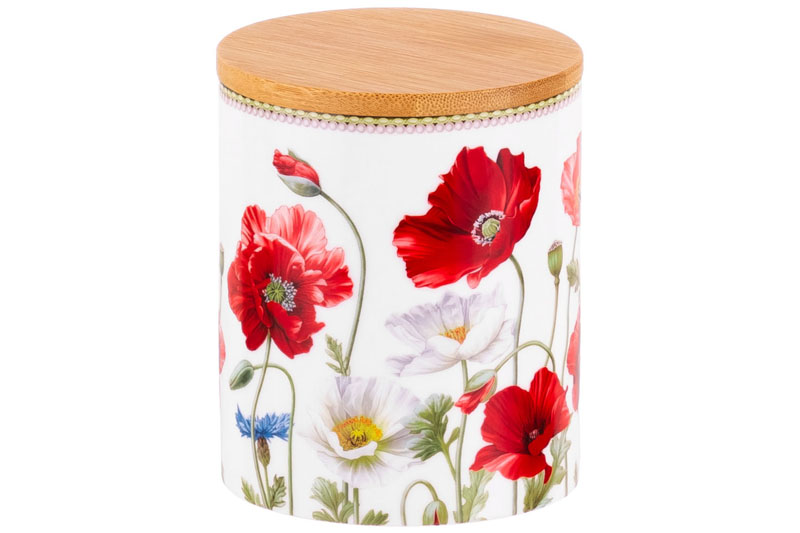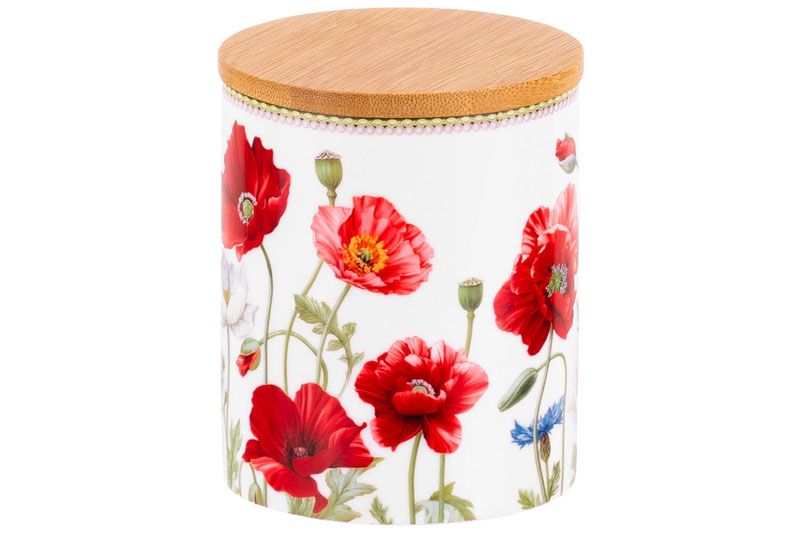 БЫЛО 731 руб! Банка д/хранения 650 мл 10*10*12,5 см "Маки" с деревянной крышкой с силикон.уплотн. NEW BONE CHINA