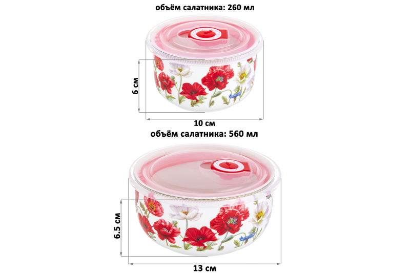 БЫЛО 757 руб! Набор 2 салатников 560 мл 13*13*6,5 см + 260 мл 10,5*10,5*6 см "Маки" с плас.крыш. NEW BONE CHINA