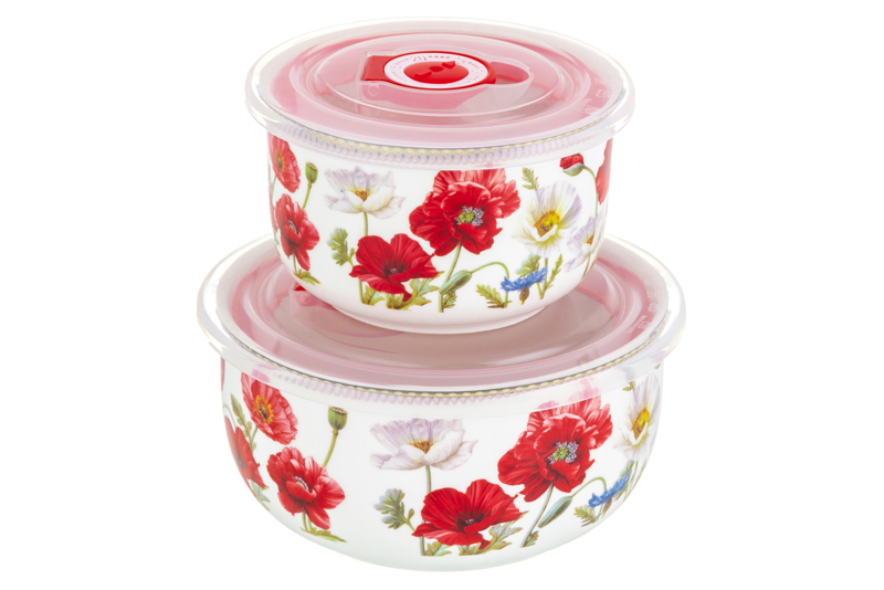 Набор Elan Gallery из серии "Маки" состоит из 2 салатников с пластиковыми крышками разного объема: 560 мл и 260 мл. Контейнеры подойдут для сервировки, транспортировки и помогут компактно хранить продукты. Размеры кухонных ёмкостей 13х13х6,5 см и 10,5х10,5х6 см. Пустые чаши можно компактно хранить друг в друге. Комплект выполнен из высококачественного фарфора new bone china. New bone china сочетает в себе изящность и высокую прочность. От других видов костяного фарфора материал отличается большей экологичностью в производстве. Крышки на глубоких блюдах выполнены из пищевого пластика полипропилена и имеют силиконовые уплотнители. Пищевой пластик не выделяет вредных веществ и безопасен для здоровья. Фарфоровые миски имеют на крышечках клапаны для контроля воздуха внутри и календарные индикаторы. Можно отслеживать, сколько дней хранится пища в салатниках. Серия "Маки" украшена красочным принтом с крупными цветами. Изображение красных и белых маков на фарфоре добавит ярких красок вашей кухне. Универсальный инвентарь подходит для хранения в холодильнике и транспортировки готовых блюд. Благодаря красочному дизайну подходит для подачи салатов на стол. За счёт глубокой формы миски удобны для смешивания ингредиентов. Можно использовать для различной еды на даче и пикнике. Не рекомендуется применять абразивные моющие средства. С открытым клапаном на крышке можно разогревать в микроволновой печи. Можно мыть в посудомоечной машине. Набор поставляется в яркой картонной упаковке. Салатники из серии посуды "Маки" станут украшением вашей кухни или приятным подарком на любой праздник. Благодаря стильной коробочке не понадобится подарочная упаковка. В коллекции бренда Elan Gallery можно найти сервировочные блюда, тарелки и ёмкости для хранения на любой вкус. Ознакомьтесь со всем ассортиментом товаров для дома.